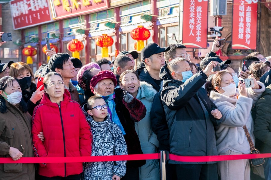 2024年2月15日,人們在呼和浩特市玉泉區(qū)塞上老街旅游休閑街區(qū)觀看社火表演。丁根厚 攝