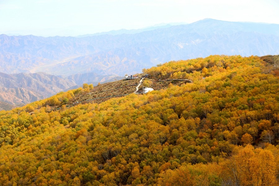 9月26日,游客在一片金黃的固陽(yáng)馬鞍山游玩