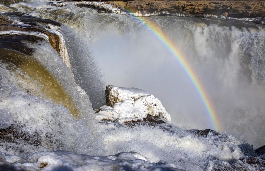 2月6日,受近日持續(xù)降溫天氣影響,位于秦晉大峽谷的陜西壺口瀑布景區(qū)出現(xiàn)冰瀑玉壺景觀。從空中俯瞰,滔滔黃河水奔騰咆哮,場面蔚為壯觀,飛濺起的浪花和彌漫的水霧在兩岸巖石和護(hù)欄上迅速凝結(jié),形成形狀各異的冰掛,晶瑩剔透,美不勝收,飛瀑上空偶現(xiàn)的彩虹與冰掛同框,交相輝映。由于近期黃河水流量上漲,達(dá)到700立方米每秒,景區(qū)主側(cè)瀑布攜手傾瀉,呈現(xiàn)“90版50元人民幣”上的壯美瀑布景觀,游客一次旅程可觀看雙瀑奇觀。