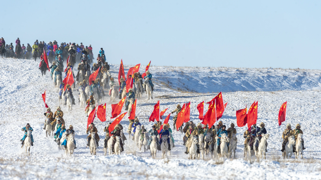 9時(shí)50分,在護(hù)旗方陣的護(hù)衛(wèi)下,鮮艷的五星紅旗冉冉升起,《義勇軍進(jìn)行曲》響徹云霄,萬人肅立齊唱。方陣入場(chǎng)式上,200名農(nóng)牧民手持火紅的辣椒、金黃的向日葵和飽滿的西瓜,用豐收的喜悅“描繪”鄉(xiāng)村振興畫卷;400名“民族大家庭”方陣成員身著五彩盛裝,恰似民族團(tuán)結(jié)的斑斕錦緞;企業(yè)代表、干部職工代表、裁判、射箭手、搏克手等方陣依次入場(chǎng),大家精神抖擻,昂首闊步,展現(xiàn)出全旗各族人民團(tuán)結(jié)奮進(jìn)的精神面貌;最令人心潮澎湃的當(dāng)數(shù)蒙古馬方陣——百匹駿馬踏著《黑駿馬》的悠揚(yáng)琴聲奔騰而來,馬蹄卷起草浪,鬃毛飛揚(yáng)如旗,將北疆兒女的豪邁氣概演繹得淋漓盡致。