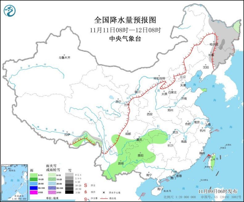 11月11日08時(shí)至12日08時(shí),黑龍江中東部和西北部、吉林大部、西藏東南部等地部分地區(qū)有小到中雪。西藏東南部、湖北南部、湖南北部、四川盆地東南部、四川南部、西南地區(qū)東南部、云南中南部、廣西西北部、臺(tái)灣島東部等地部分地區(qū)有小雨。