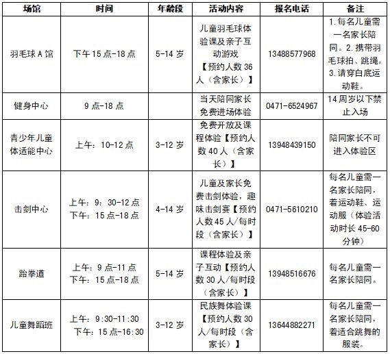 記者從內蒙古體育館了解到,六一兒童節(jié)當日,該館羽毛球、健身中心、青少年兒童體適能中心、擊劍中心、跆拳道、兒童舞蹈班為14周歲以下的兒童準備了豐富的免費體驗活動項目。