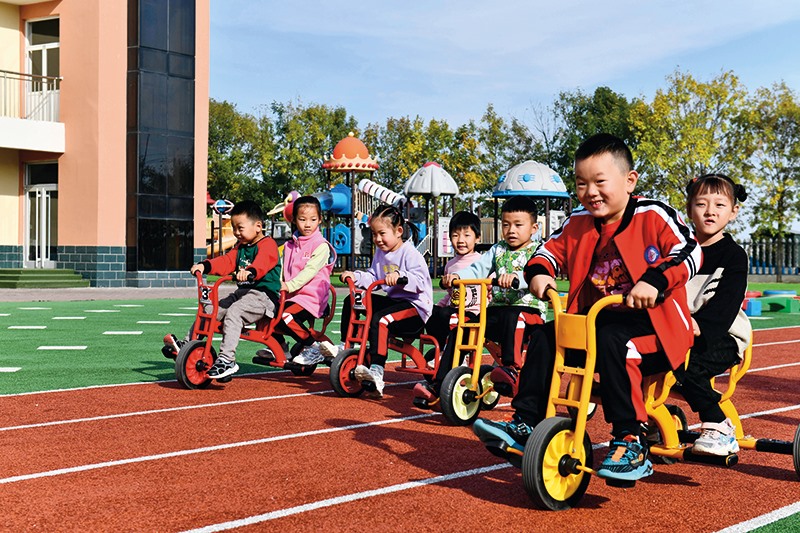 在山東省東營市墾利區(qū)楊廟社區(qū)幼兒園,孩子們在老師的帶領(lǐng)下進(jìn)行戶外活動(2021年10月19日攝) 郭緒雷攝