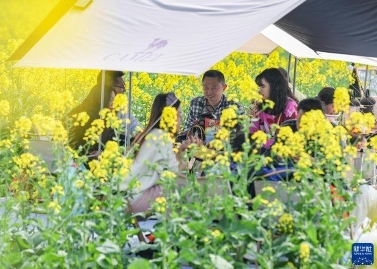 近日,位于四川成都崇州市的數(shù)萬畝油菜花競(jìng)相綻放,吸引游客前來踏春觀光。