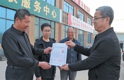 山東省平原縣鄉(xiāng)村振興服務(wù)中心工作人員為農(nóng)民農(nóng)藝師王篤春(左一)頒發(fā)證書。辛 凱攝