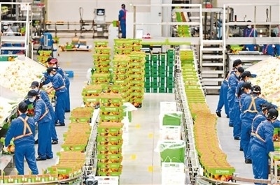2022年11月27日,江西省贛州市信豐縣高新技術(shù)產(chǎn)業(yè)園區(qū)的一家臍橙加工企業(yè),工人在智能分選包裝生產(chǎn)線上篩選裝運(yùn)臍橙鮮果。 朱海鵬攝(人民視覺(jué))