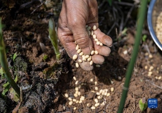 4月15日,村民在貴州省開陽(yáng)縣南龍鄉(xiāng)中橋村中藥材種植基地套種黃豆。