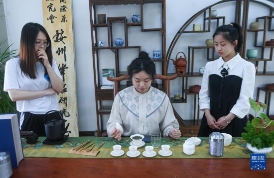 4月19日,茶藝師在演示沖泡婺州舉巖茶。
