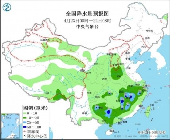 4月22日08時至23日08時,新疆沿天山高海拔地區(qū)和南疆南部、西藏東部、青海中南部、甘肅中南部、寧夏中北部、陜西中北部、山西等地部分地區(qū)有小到中雪或雨夾雪,其中甘肅中部、陜西北部、山西中南部等地部分地區(qū)有大雪;西藏東南部、華北南部、黃淮西部、江淮西南部、江漢南部、江南大部、重慶東北部、貴州東部、華南北部和南部等地部分地區(qū)有中到大雨,其中,湖南、江西中北部、廣西北部、廣東西北部等地部分地區(qū)有暴雨(50~90毫米)。西藏北部、江蘇北部等地部分地區(qū)有4~6級風。東海北部海域、黃海南部海域、臺灣海峽將有5~6級、陣風7級的東北風。
