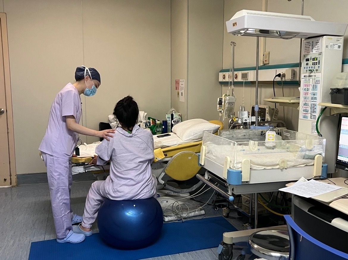 助產(chǎn)士吳靜正幫助一名出現(xiàn)宮縮的孕產(chǎn)婦再瑜伽球上運(yùn)動。