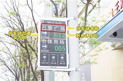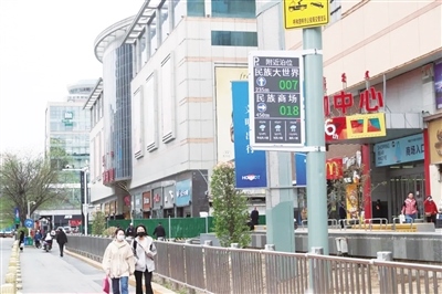 5月7日上午,在中山西路,記者看到懸掛的智能停車指引屏上顯示附近停車場的位置,以及停車場的停車位余量。維多利購物中心附近的一個(gè)智能停車指引屏上顯示民族大世界有7個(gè)空余停車位、民族商場有18個(gè)空余停車位,而這些數(shù)據(jù)也在實(shí)時(shí)更新,市民根據(jù)智能停車指引屏的信息便能輕松找到停車位,不用再為停車難而發(fā)愁。