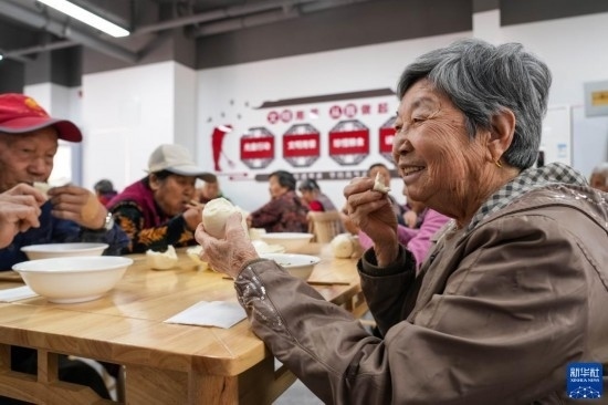 5月12日,北汝村老年村民在幸福食堂吃午餐。