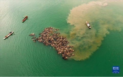 5月13日,在南充市蓬安縣相如鎮(zhèn)油房溝村嘉陵江段,成群結隊的水牛渡江。