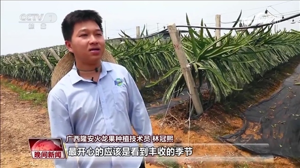隆安火龍果種植技術(shù)員 林冠熙:不再是以前的那種面朝黃土背朝天的農(nóng)業(yè)模式,有時我們可能在電腦面前點開開關(guān),我們就可以給植物灌水灌肥。最開心的應(yīng)該是看到豐收的季節(jié),看到滿地滿果通紅的畫面,就覺得這是豐收的喜悅。
