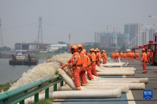 6月2日,在水域救援實(shí)戰(zhàn)演習(xí)現(xiàn)場(chǎng),消防救援人員在湘江邊模擬內(nèi)澇排水。