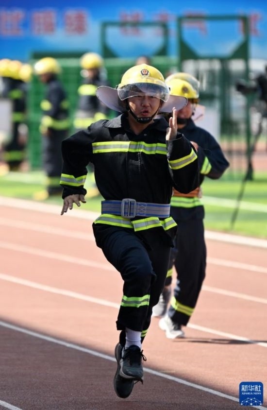6月2日,大學生代表參加身穿消防服100米跑趣味消防運動比賽。