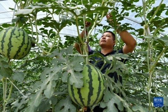 6月4日,農(nóng)民在獻縣河城街鎮(zhèn)梅莊洼農(nóng)場大棚內(nèi)管理種植的西瓜。
