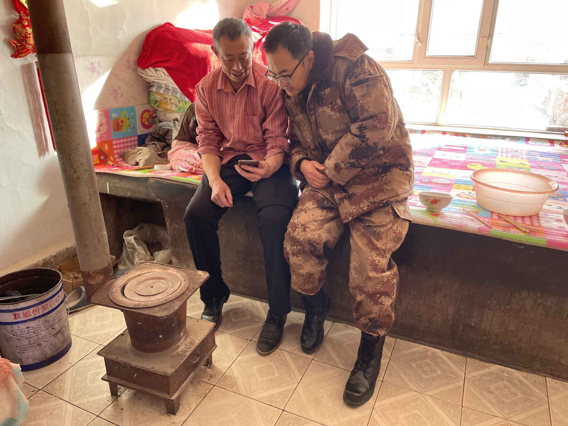 村民高興地向閻書記展示在家里撥打電話