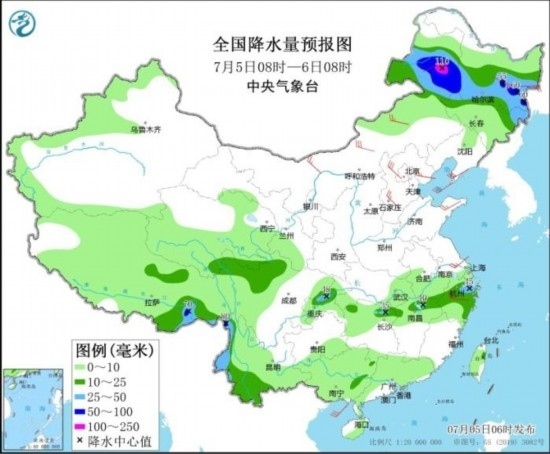 預(yù)計(jì),7月5日08時(shí)至6日08時(shí),內(nèi)蒙古東北部、黑龍江中南部以及云南西部、重慶中部、浙江北部等地部分地區(qū)有大到暴雨,其中,內(nèi)蒙古東北部局地有大暴雨(100~110毫米)。上述部分地區(qū)伴有短時(shí)強(qiáng)降水(最大小時(shí)降雨量20~50毫米,局地可超過60毫米),局地有雷暴大風(fēng)等強(qiáng)對(duì)流天氣。中央氣象臺(tái)7月5日06時(shí)繼續(xù)發(fā)布暴雨藍(lán)色預(yù)警。