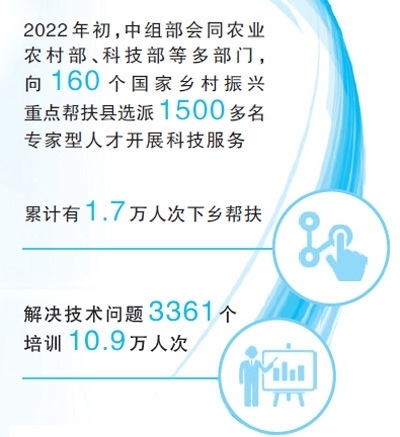 2022年初,中組部會同農(nóng)業(yè)農(nóng)村部、科技部等多部門,以“一縣一團”方式,向160個國家鄉(xiāng)村振興重點幫扶縣選派1500多名專家型科技支撐人才,精準(zhǔn)開展科技服務(wù)和人才培養(yǎng)幫帶。