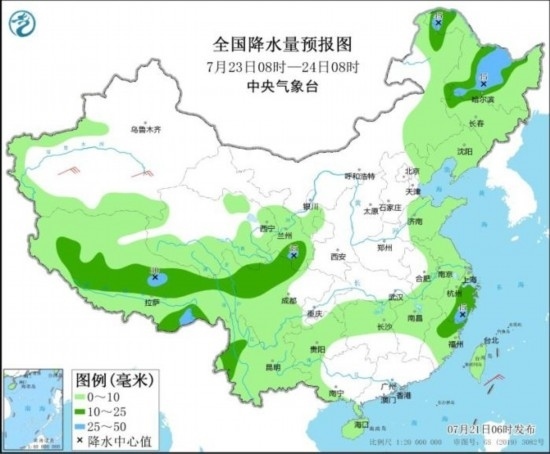 圖4 全國降水量預(yù)報圖(7月23日08時-24日08時)