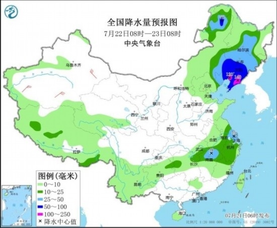 預(yù)計,7月21日08時至22日08時,內(nèi)蒙古東北部、河北東部、北京、天津、山東西北部、河南東南部、湖北東部、江西北部、四川南部等地部分地區(qū)有大到暴雨,其中,河北中部、北京東南部、天津南部等地局地有大暴雨(100~130毫米)。上述部分地區(qū)伴有短時強降水(最大小時降雨量20~50毫米,局地可超過60毫米),局地有雷暴大風等強對流天氣。中央氣象臺7月21日06時繼續(xù)發(fā)布暴雨藍色預(yù)警。