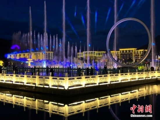 音樂(lè)水秀噴泉位于工布公園人工生態(tài)湖中。