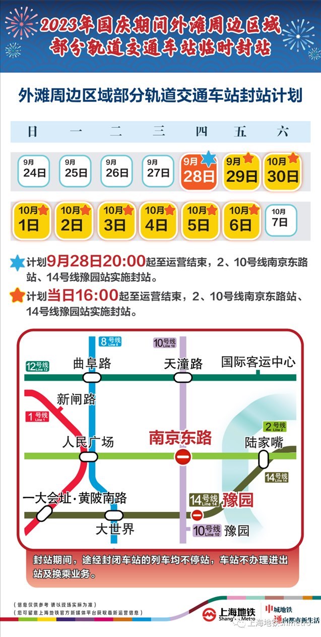 此外,9月28日20:00至運(yùn)營(yíng)結(jié)束,以及9月29日至10月6日的每日16:00至運(yùn)營(yíng)結(jié)束,地鐵2、10號(hào)線南京東路站,14號(hào)線豫園站計(jì)劃實(shí)施封站跳停。