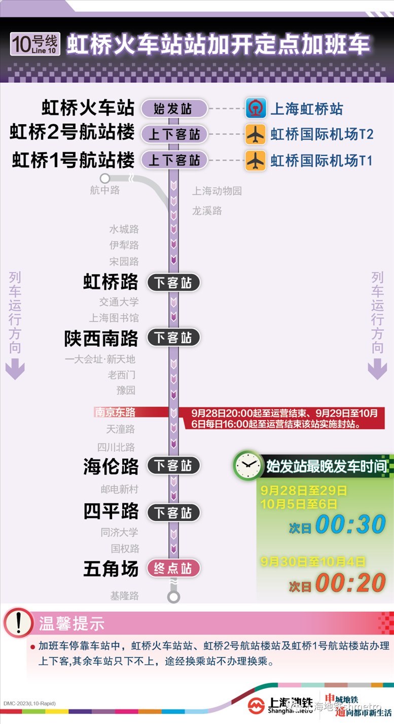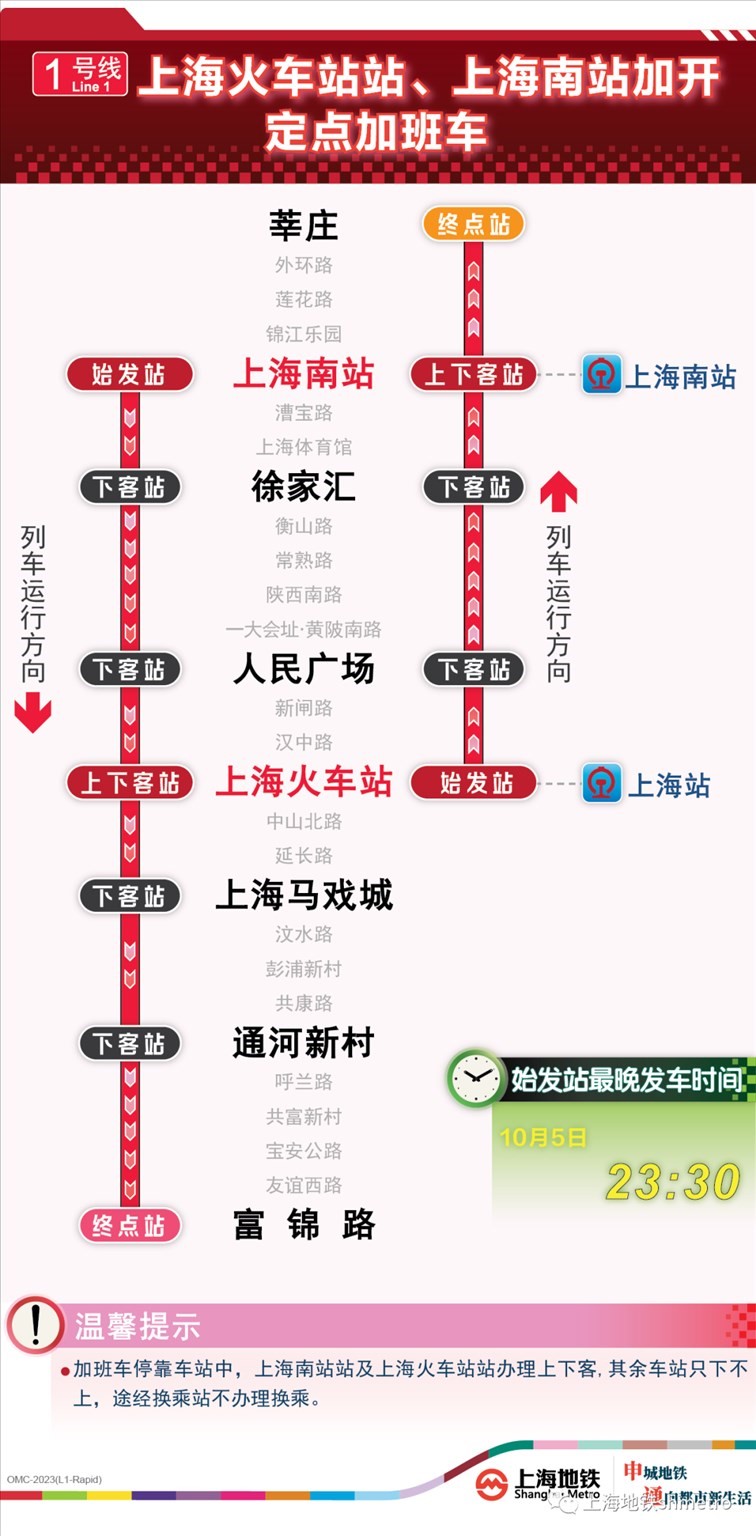 此外為做好節(jié)假日返程期間上?;疖囌尽⒑鐦蚧疖囌?、上海南站的夜間客流疏散工作,10月5日,地鐵1號(hào)線在圖定基礎(chǔ)上實(shí)施定點(diǎn)加開(kāi)方案,加開(kāi)末班車發(fā)車時(shí)間至23:30;另10月8日地鐵2號(hào)線增加定點(diǎn)加班車班次,加開(kāi)末班車發(fā)車時(shí)間至次日0:00。