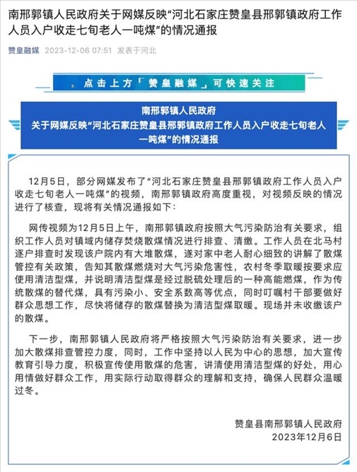 ·河北石家莊贊皇一工作人員入戶(hù)收走7旬老人一噸過(guò)冬煤?官方:現(xiàn)場(chǎng)未收繳。