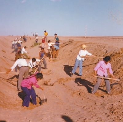 上世紀80年代,磴口縣干部群眾在挖掘灌溉渠。中國林科院沙漠林業(yè)實驗中心供圖