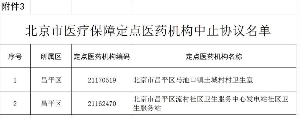 北京市昌平區(qū)馬池口鎮(zhèn)土城村村衛(wèi)生室等2家定點醫(yī)藥機構(gòu)因不能繼續(xù)為參保人員提供服務(wù),申請中止協(xié)議,經(jīng)市、區(qū)醫(yī)保經(jīng)辦機構(gòu)審核,現(xiàn)決定對上述2家定點醫(yī)藥機構(gòu)中止協(xié)議(見附件3)。