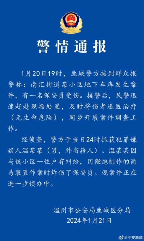 ·溫州警方通報“某小區(qū)1名保安被炸傷”:犯罪嫌疑人已被抓獲。