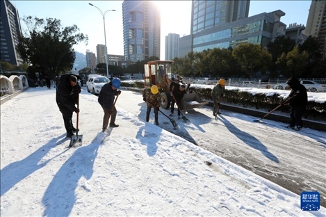 1月23日,在浙江省溫嶺市,人們?cè)谇宄访姹=?,受寒潮天氣影響,我?guó)多地迎來(lái)降溫降雪天氣,各地積極組織相關(guān)部門(mén)開(kāi)展抗凝除雪工作,保安全保暢通。新華社發(fā)(周學(xué)軍攝)