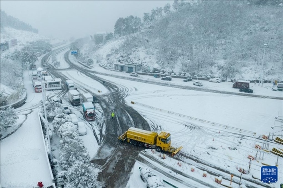 1月22日,在湖南省婁底市一高速收費(fèi)站,除雪車(chē)在作業(yè)(無(wú)人機(jī)照片)。近日,受寒潮天氣影響,我國(guó)多地迎來(lái)降溫降雪天氣,各地積極組織相關(guān)部門(mén)開(kāi)展抗凝除雪工作,保安全保暢通。新華社發(fā)(吳永華攝)