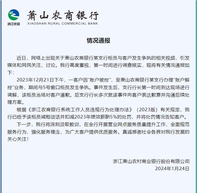 ·杭州蕭山農(nóng)商銀行柜員對(duì)客戶大吼“滾”,銀行回應(yīng):扣減5%績(jī)效。