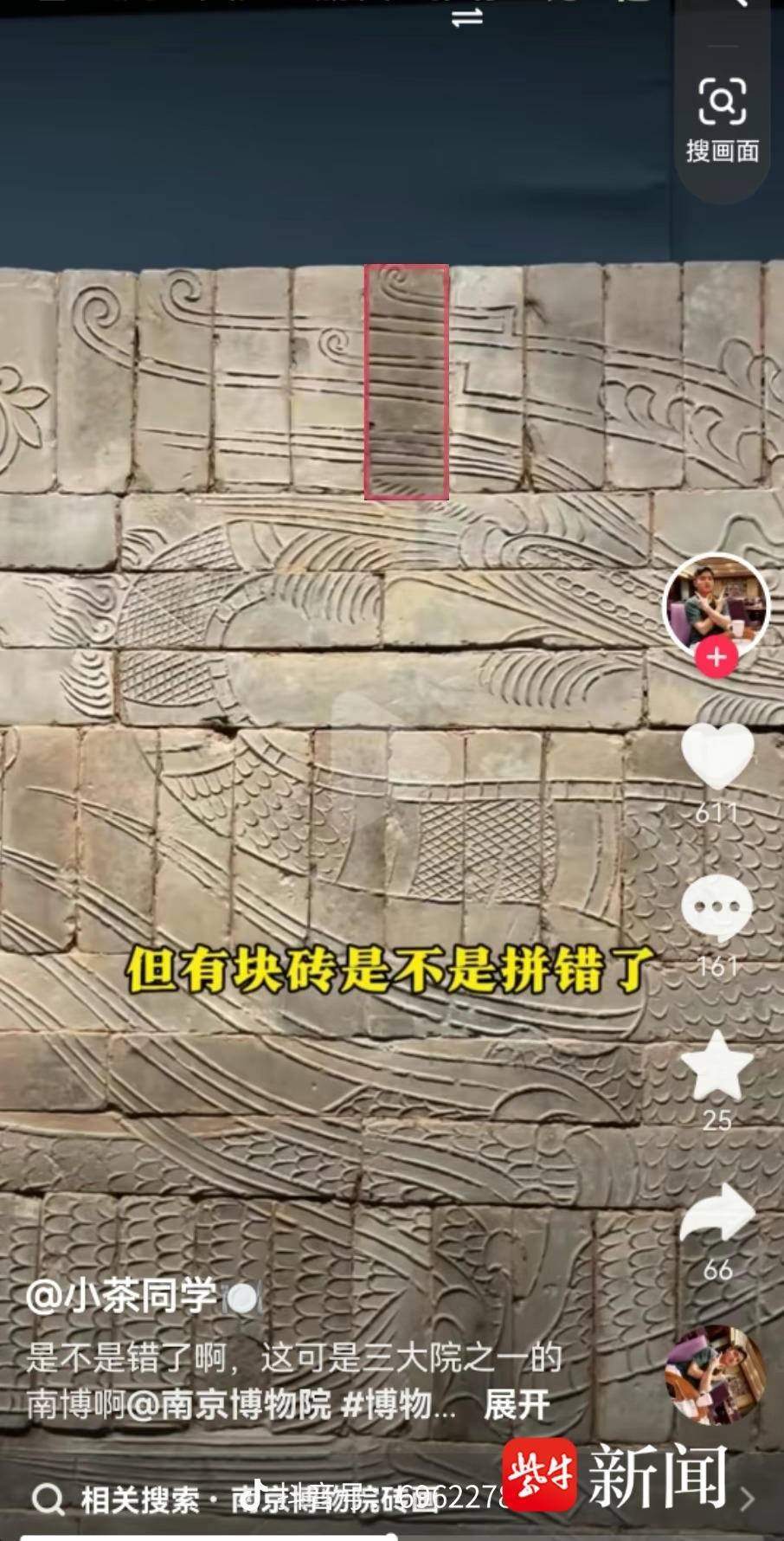 龍年之際,與龍有關(guān)的文物備受關(guān)注。近日,有網(wǎng)友在南京博物院游覽時(shí),發(fā)現(xiàn)館中展覽文物《羽人戲龍磚畫(huà)》第一排有一塊磚顏色比附近的磚更深,且磚上的紋路和旁邊的磚也不契合,懷疑是裝反了。于是他將相關(guān)內(nèi)容拍成視頻發(fā)到抖音上求助,視頻發(fā)布后,引發(fā)多方討論。記者從專家處了解到,確實(shí)裝反了,至于原因還有待核查。