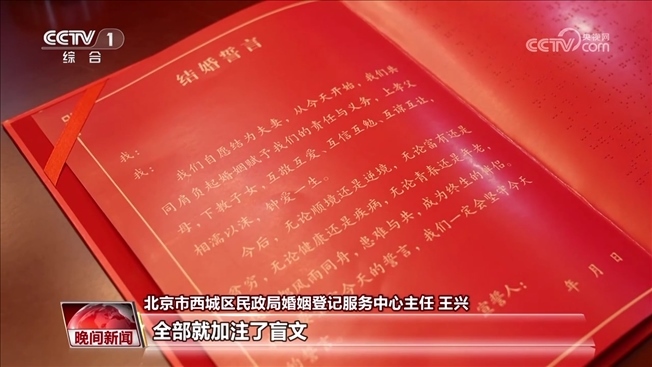 北京市西城區(qū)民政局婚姻登記服務(wù)中心主任 王興:我們通過這次活動(dòng)也是跟盲文出版社正式把這個(gè)結(jié)婚登記的告知單,還有結(jié)婚誓言,全部就加注了盲文,等以后再有相同需求的殘疾人到我們婚姻登記(服務(wù)中心)登記結(jié)婚,我們會給他們提供一套相應(yīng)的流程。