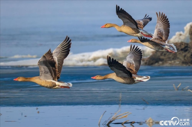 新疆巴州,隨著天氣轉暖,冰雪消融的博斯騰湖迎來大批候鳥。