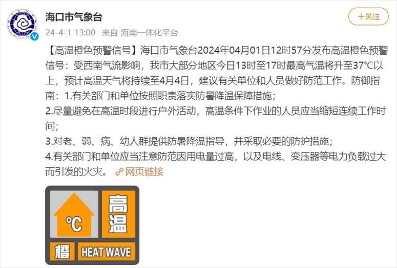 央視網(wǎng)消息:據(jù)@海口市氣象臺(tái) 微博消息,海口市氣象臺(tái)2024年04月01日12時(shí)57分發(fā)布高溫橙色預(yù)警信號(hào):受西南氣流影響,海口市大部分地區(qū)今日13時(shí)至17時(shí)最高氣溫將升至37℃以上,預(yù)計(jì)高溫天氣將持續(xù)至4月4日,建議有關(guān)單位和人員做好防范工作。