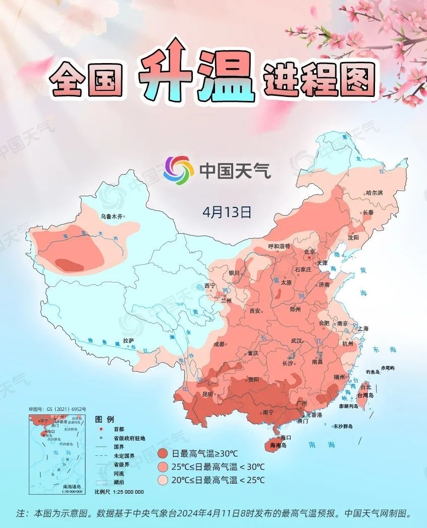 眼下,全國大部處于冷空氣影響間歇期,升溫是主旋律。預(yù)計今起三天(4月11日至13日),我國從北到南都將開啟回暖進(jìn)程,最高氣溫25℃以上的區(qū)域幾乎覆蓋整個中東部,波及20余省份,東北、西北地區(qū)氣溫將大面積創(chuàng)今年以來新高,北方不少地方還會體驗到常年5月中旬才有的超前暖熱。中國天氣網(wǎng)推出全國升溫進(jìn)程圖,看看哪些地方將沖擊30℃。
