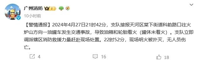 中新網(wǎng)4月28日電 據(jù)廣州消防微博消息,2024年4月27日21時(shí)42分,支隊(duì)接報(bào)天河區(qū)棠下街道科韻路口往火爐山方向一油罐車發(fā)生交通事故,導(dǎo)致油箱和輪胎著火(罐體未著火)。支隊(duì)立即調(diào)派轄區(qū)消防救援力量趕赴現(xiàn)場處置。22時(shí)52分,現(xiàn)場明火被撲滅,無人員傷亡。