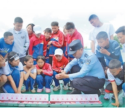 內(nèi)蒙古自治區(qū)通遼市科爾沁左翼后旗公安局禁毒大隊民警走進該旗蒙古族實驗小學,向學生們展示“笑氣”模型。周連龍攝