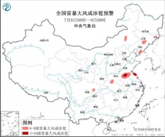 全國雷暴大風或冰雹預警(7月8日08時-9日08時)