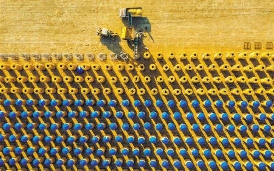 10月15日,浙江省樂(lè)清市勝利塘內(nèi)的“農(nóng)光互補(bǔ)”光伏發(fā)電項(xiàng)目基地,農(nóng)戶將收割好的稻谷裝袋。蔡寬元攝(中經(jīng)視覺(jué))