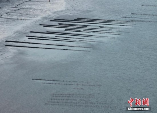 5月2日,福建福州福清市沙埔鎮(zhèn)養(yǎng)殖海域,退潮后灘涂猶如一幅天然的水墨畫卷。(無人機照片)