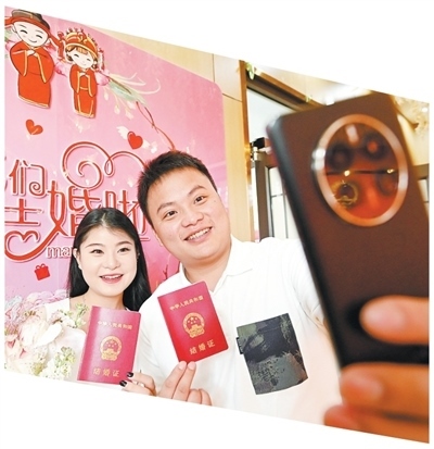一對新人在河北邯鄲峰峰礦區(qū)婚姻登記服務中心自拍留念。