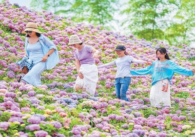 浙江紹興古筑村繡球花綻放,環(huán)境優(yōu)美,吸引眾多游客前來賞花。