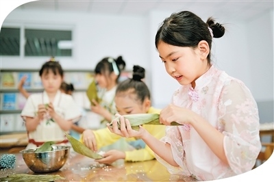 在山東省青島市市北區(qū)杭州路小學,學生體驗包粽子。