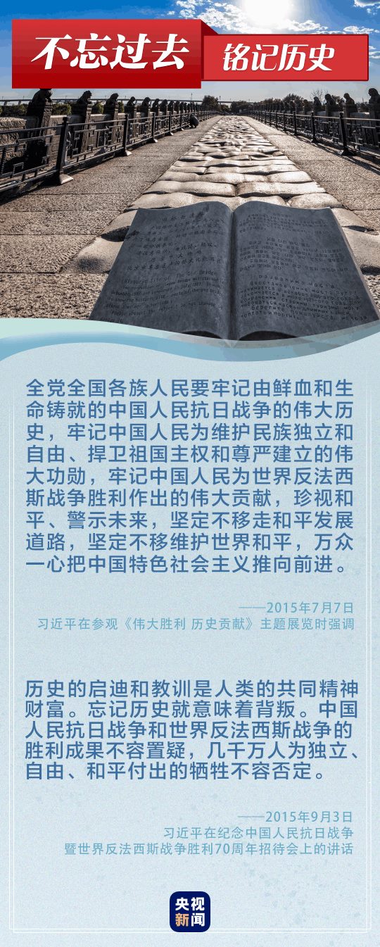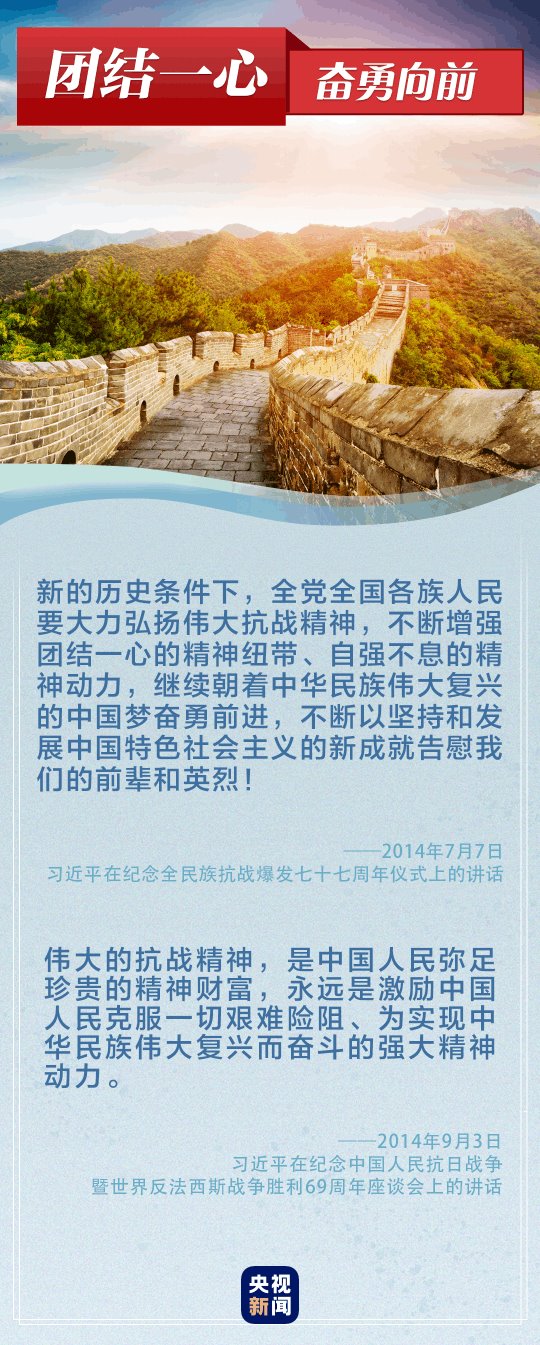 “偉大的抗戰(zhàn)精神,永遠是激勵中國人民克服一切艱難險阻、為實現(xiàn)中華民族偉大復興而奮斗的強大精神動力?!薄罢x必勝!和平必勝!人民必勝!”黨的十八大以來,習近平總書記多次談到抗戰(zhàn)精神。讓我們重溫總書記重要論述,銘記歷史、奮勇向前。